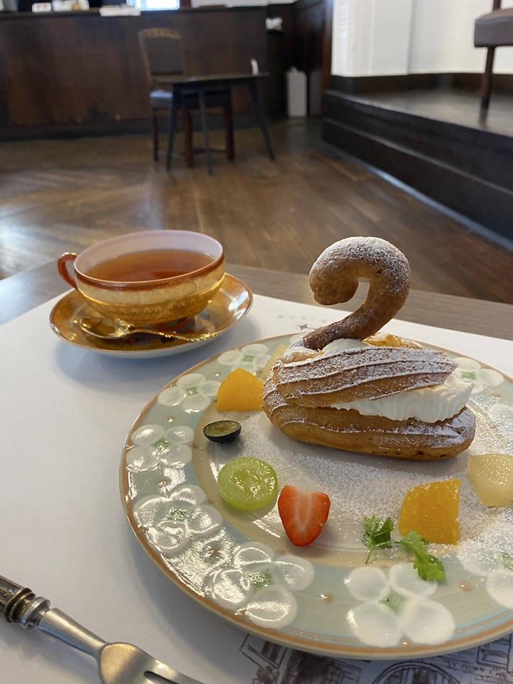 2階ホールで実施。パティスリー・セトロワのスワンシューとプリンアラモード
